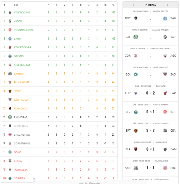 Após a terceira rodada veja como ficou a classificação do Campeonato Brasileiro 2020