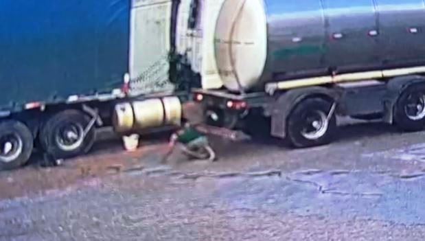 Carreta passa sobre pedestre em posto de combustível no Paraná e ele sobrevive