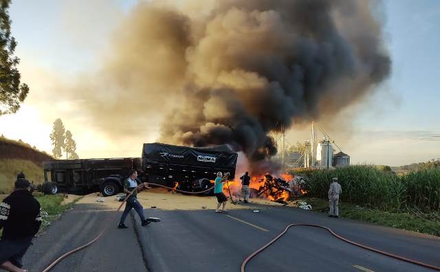 Após o choque os dois bitrens incendiaram e o Vectra foi parar fora da pista em meio a uma lavoura. Equipes do Corpo de Bombeiros de Pato Branco foram acionadas para controlar as chamas e tentar encontrar vítimas feridas. A princípio, duas vítimas fatais foram encontradas em meio aos escombros, provavelmente a dos motoristas que ainda não foram identificados. (RBJ – Foto Altair Merlo/Rádio Itapuã).