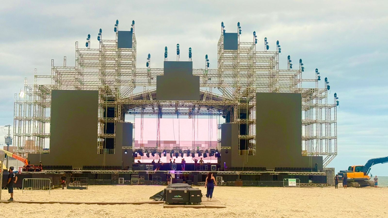O palco nas areias de Matinhos começou a ser montado no dia 17 de dezembro. Ele terá 45 metros de largura, 21 metros de altura e 23 metros de profundidade, dimensões superiores às de 2025 — 39 metros de largura, 14 metros de altura e 16 metros de profundidade. Já é possível ver bem como ficará a área de camarotes.