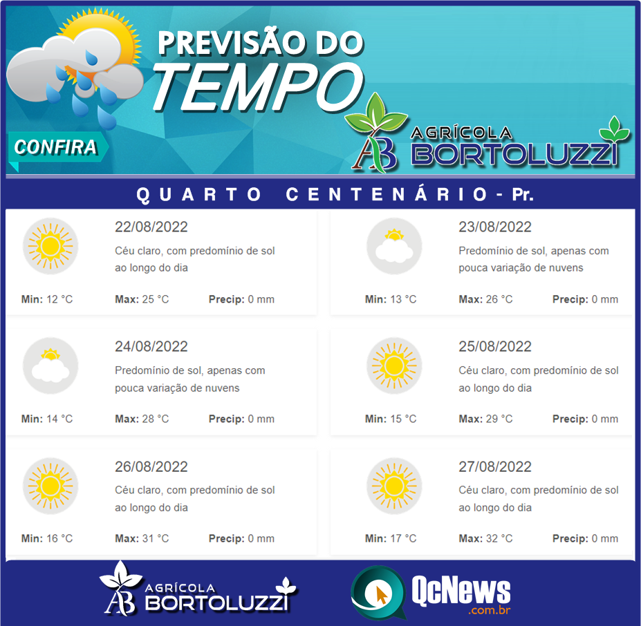 Confira a previsão do tempo para a semana em Quarto Centenário