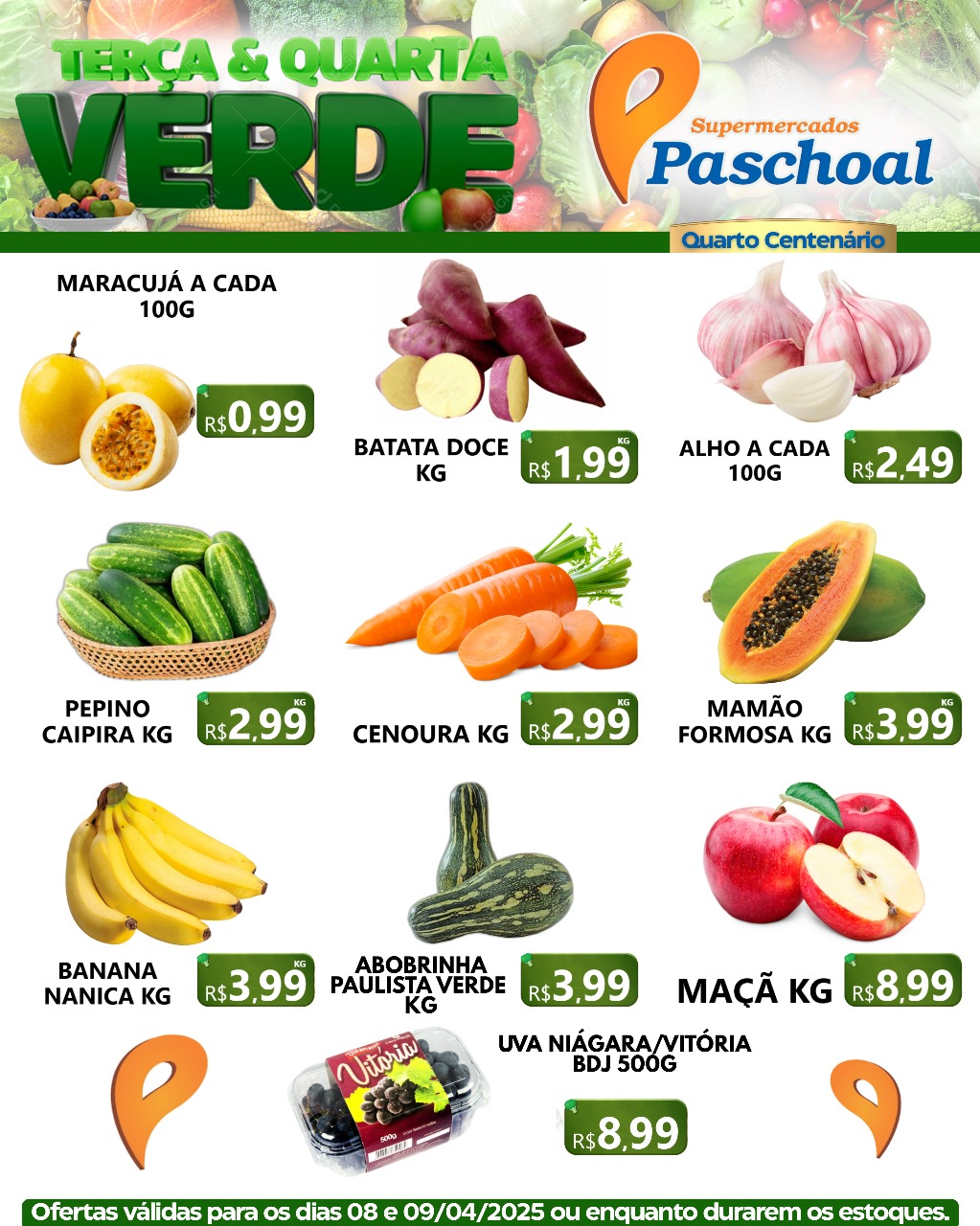 Todas as Terças e Quartas os clientes dos Supermercados Paschoal tem descontos especiais em frutas, legumes e verduras fresquinhas!