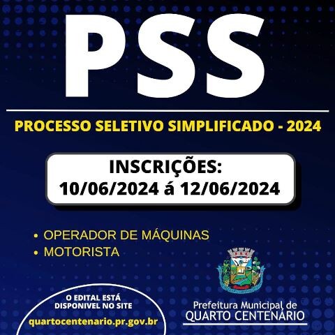 A Prefeitura de Quarto Centenário anunciou a abertura das inscrições para o processo seletivo simplificado destinado à contratação de cinco motoristas e dois operadores de máquina. As inscrições começam nesta segunda-feira, 10, e se encerram na quarta-feira, 12.