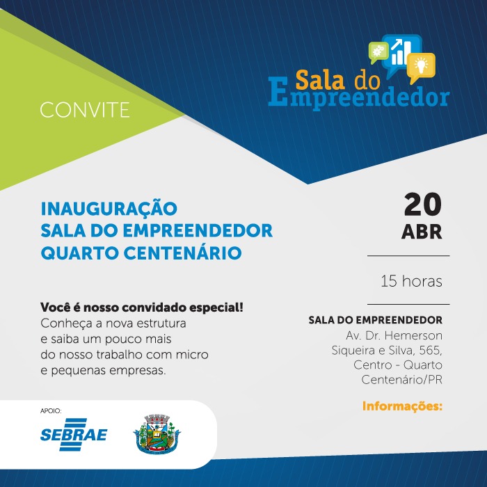 A Prefeitura de Quarto Centenário inaugura nesta quarta-feira, 20 , a Sala do Empreendedor que será um espaço para o atendimento e suporte aos microempreendedores individuais, além de apoiar iniciativas empreendedoras no município.