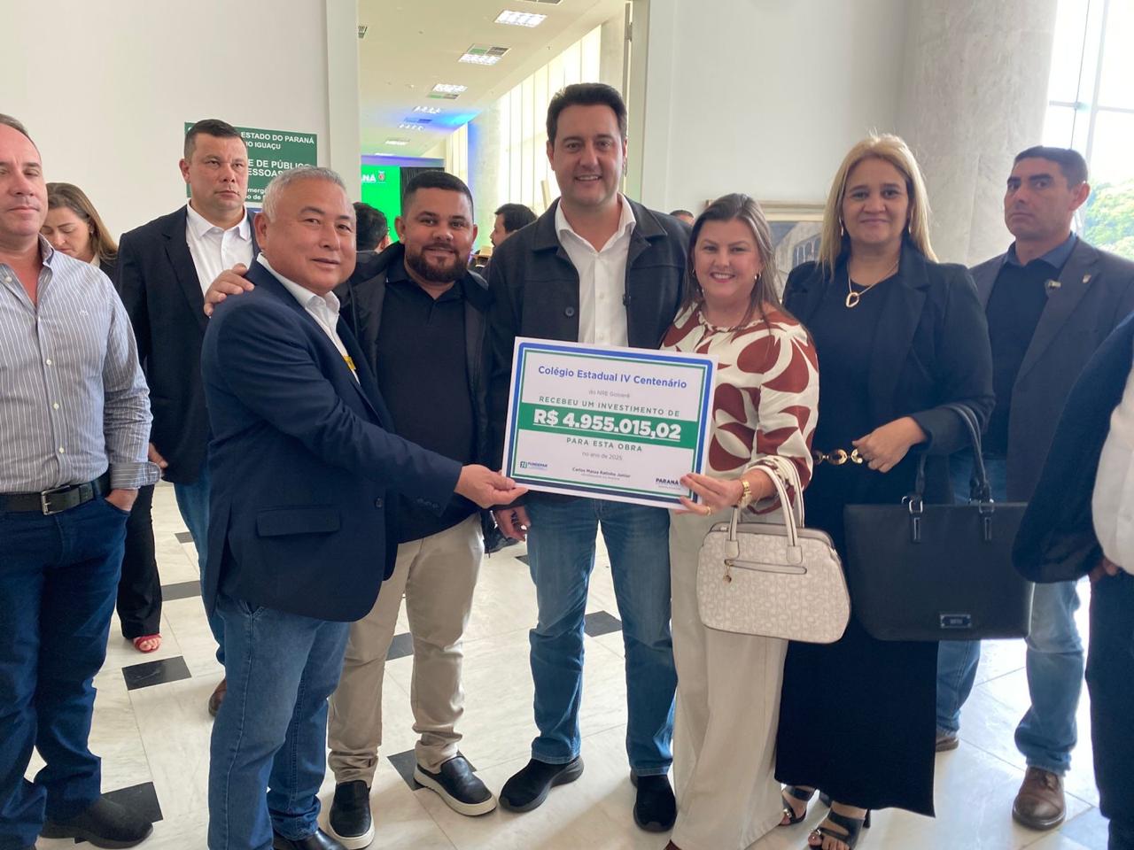 Na manhã desta terça-feira, 21, o prefeito Akio Abe, acompanhado do vereador Erminho Mercado, da secretária municipal de Educação, Ângela Tunin, e da diretora do Colégio Estadual de Quarto Centenário, Solange, estiveram no Palácio Iguaçu, em Curitiba, onde receberam das mãos do governador Ratinho Júnior e do secretário de Educação, Roni Miranda, o anúncio de um grande investimento no município.