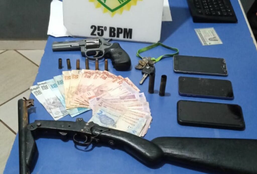 Foram recuperados os objetos roubados e também as roupas usadas pelos acusados no crime. Além disso, os policiais apreenderam um revólver, munições – duas delas deflagradas, carabina calibre 32 em áreas próximas e celulares.