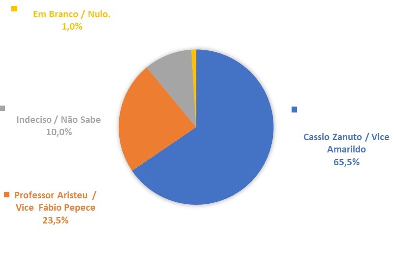 Em segundo lugar, aparece o Professor Aristeu, com 23,5% das intenções de voto. Os indecisos somam 10%, enquanto votos brancos e nulos representam 1% do total. A pesquisa, realizada no dia 14 de setembro, ouviu 200 eleitores da cidade. A margem de erro é de 6,6 pontos percentuais.