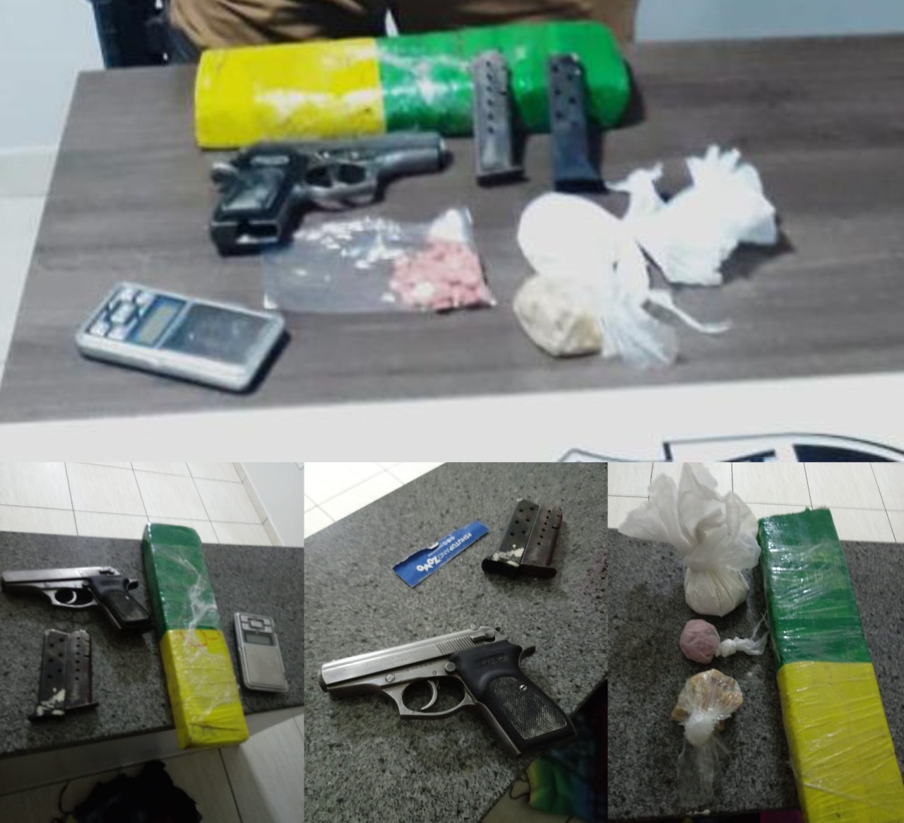 Os policiais fizeram o acompanhamento, mas pelo fato de estar escuro não foi possível localizá-lo. Durante a fuga ele deixou sob uma mesa de mármore uma pistola calibre 380 e uma sacola na cor rosa contendo várias embalagens de maconha e cocaína, LSD (bala) e crack.