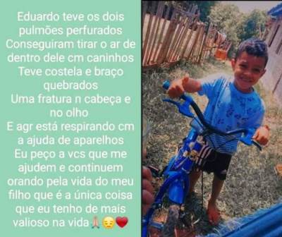 Eduardo, de quatro anos, bateu com a bicicleta na traseira de um caminhão. Ele teve fratura no braço, na costela, teve os dois pulmões perfurados, além de várias escoriações.
