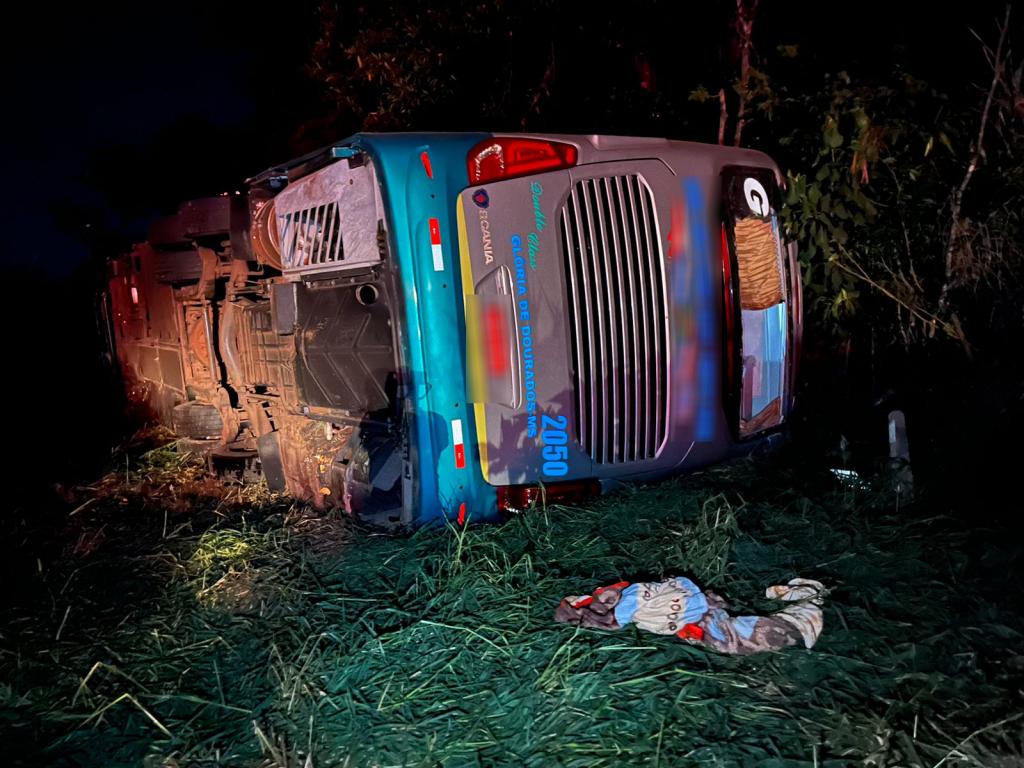 O ônibus de turismo com placas de Glória de Dourados no Mato Grosso do Sul tombou na curva da Sorasa na BR-163 em Marechal Rondon na noite de quarta-feira. O coletivo seguia de Cascavel para a região de Mundo Novo onde vários agricultores e produtores rurais voltavam do Show Rural no município de Cascavel.