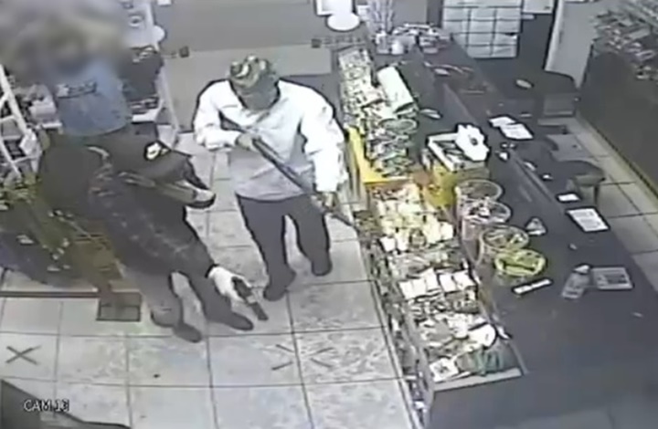 Um dos bandidos tinha uma arma curta (aparentemente uma pistola) e o outro uma arma de cano longo. Eles chegaram pela parte dos fundos do estabelecimento, renderam clientes e dois funcionário que estavam do lado externo e os obrigaram a entrar na loja de conveniências.