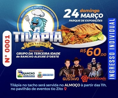 prefeitura de Rancho Alegre do Oeste confirmou a volta do prato típico na programação da festa pelos 32 anos de emancipação do município. A tilápia no tacho será servida no almoço do dia 24 de março. Os ingressos já estão à venda por R$ 60. A Expo-Racho será realizada entre os dias 22 e 24. A programação incluiu shows com Jads & Jadson, Fiduma & Jeca e Pedro Paulo & Alex, além de rodeio.