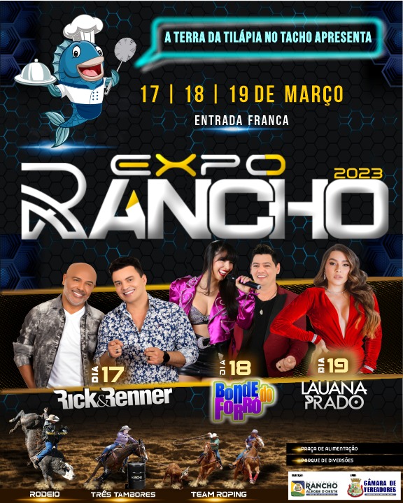 A programação de shows está definida da seguinte forma: Dia 17: Rick e Renner; Dia 18: Bonde do Forró; Dia 19: Lauana Prado. A festa contará uma ampla praça de alimentação no Pavilhão de eventos, Rodeio, Prova 3 tambores e Team Roping. Destaque para o almoço com o prato típico de Rancho Alelgre, a tilápia no tacho.