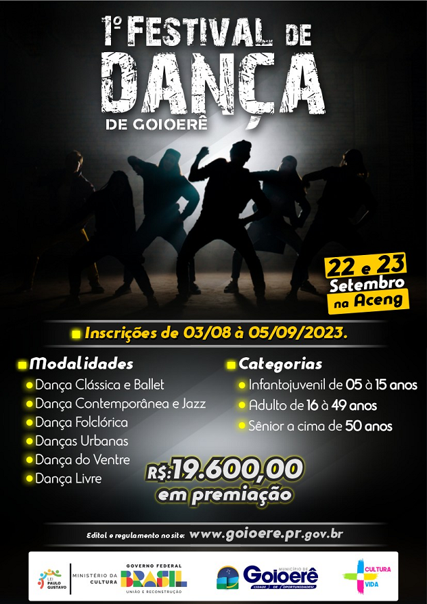 A Prefeitura de Goioerê por meio da secretaria de Cultura inicia nesta quinta-feira, 03, as inscrições para o 1º Festival de Dança do município, o evento contará com diversas categorias e modalidades e mais de 19 mil em premiação. O Festival será realizado com o apoio da Lei Paulo Gustavo.