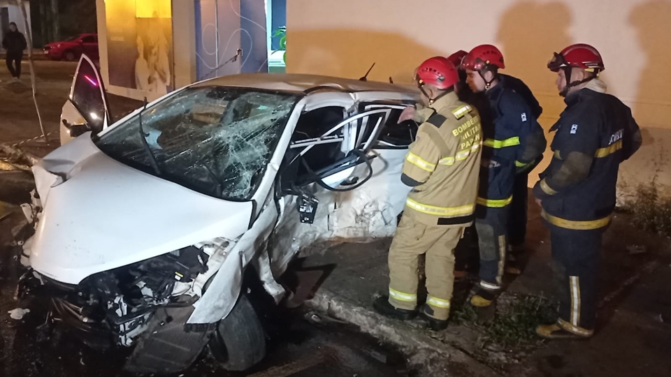 Com o impacto, o HB20 rodou, bateu em duas placas, arrancando uma delas e só parou ao chocar-se contra a coluna de uma clínica. O motorista do veículo que invadiu a preferencial ficou preso às ferragens e foi atendido com ferimentos graves pelo Corpo de Bombeiros.